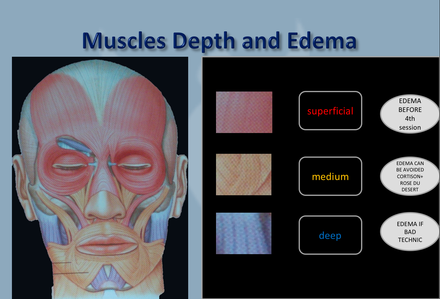 - Solo a partir de la 4ª sesión y solo si estás bien entrenado, puedes tratar los músculos superficiales como el frontal como el tercio superior de la cara, de lo contrario obtendrás un gran edema.
